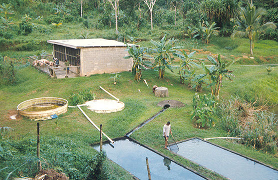 The dykes surrounding the fish ponds are covered with a polyculture of various high-protein and fast-growing crops that require minimum attention. This biodiversity on the dykes also serves the crucial function of providing biological control of "pests," preventing the use of toxic chemicals.