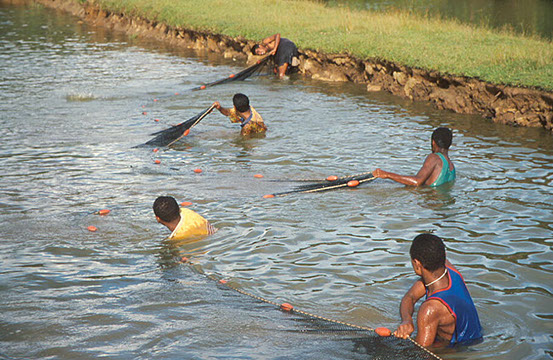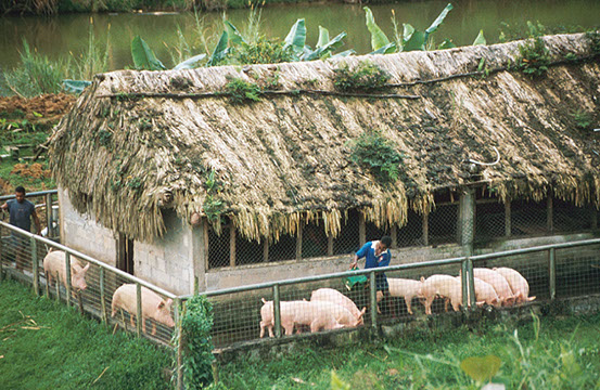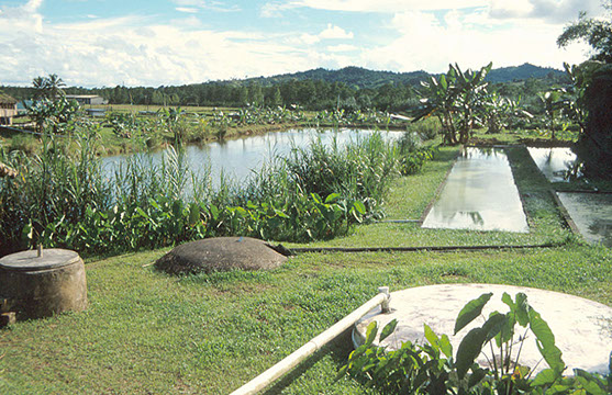 The dykes surrounding the fish ponds are covered with a polyculture of various high-protein and fast-growing crops that require minimum attention. This biodiversity on the dykes also serves the crucial function of providing biological control of "pests," preventing the use of toxic chemicals.